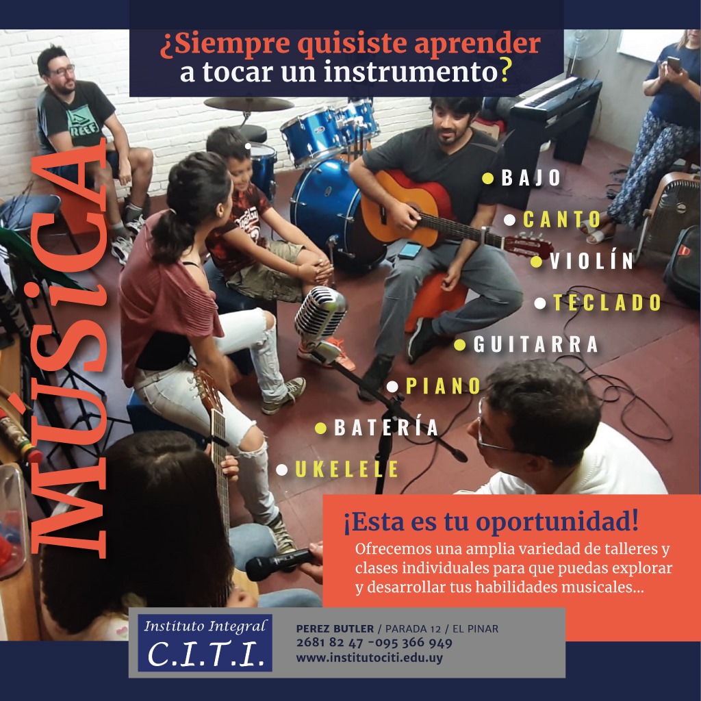 En el Instituto CITI de El Pinar te ofrecemos una amplia variedad de talleres y clases individuales de música para que puedas explorar y desarrollar tus habilidades musicales. ¿Siempre quisiste aprender a tocar un instrumento? ¡Esta es tu oportunidad! Ofrecemos clases de Guitarra, Bajo, Ukelele, Violín, Teclado, Piano, Batería y Canto.